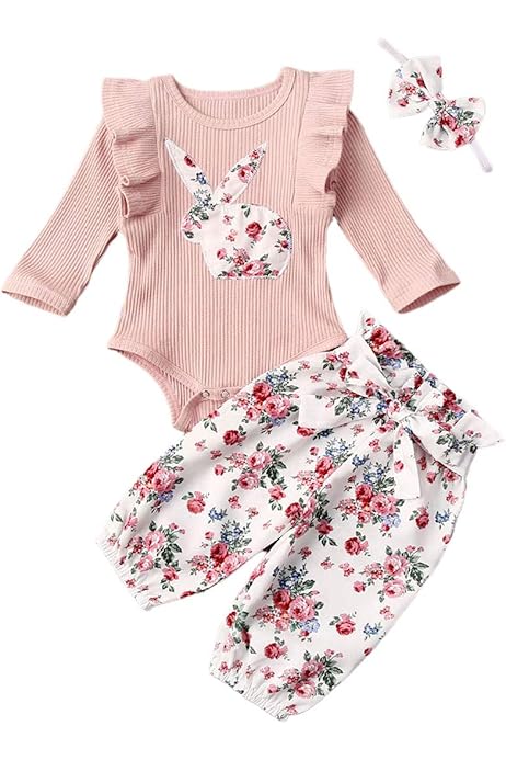 Newborn Baby Girls Easter Outfit Long Sleeve Bunny Print Romper Floral Pants Bow Headband 3pcs Set Light Pink 0 6m